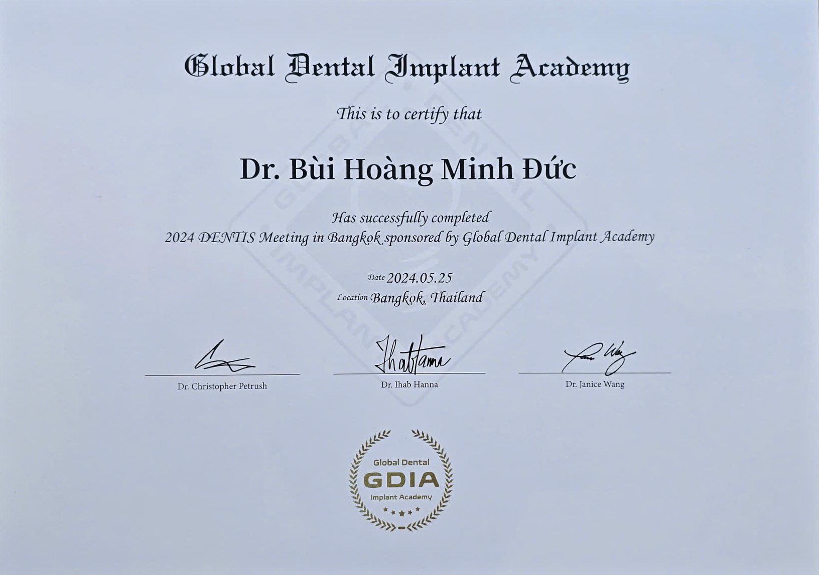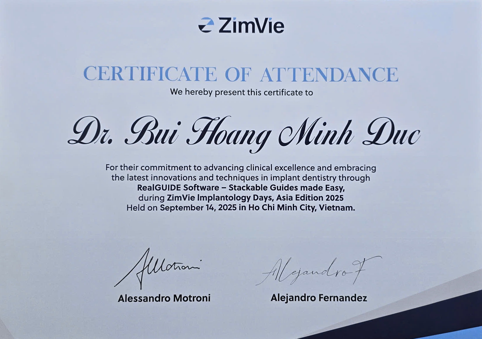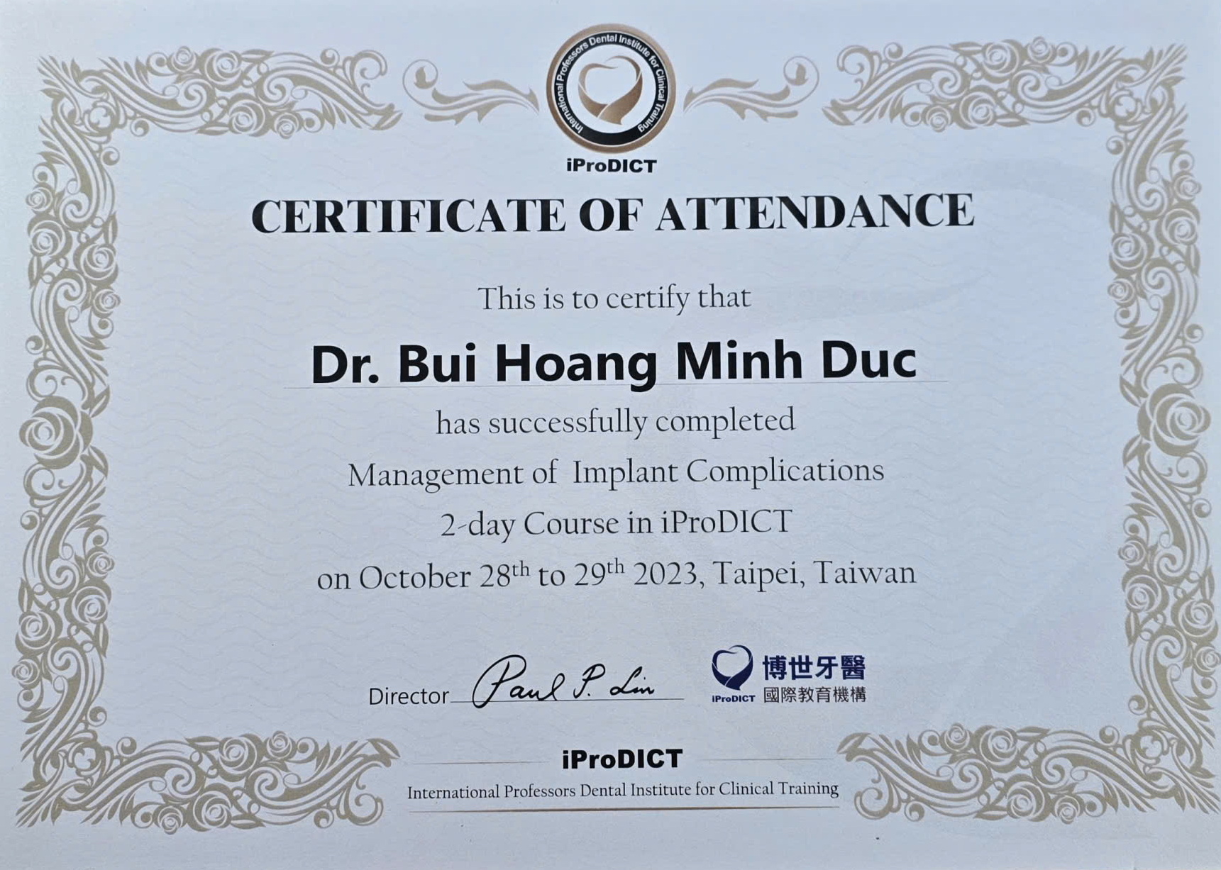 Bác Sĩ đã tham dự các khoá đào tạo chuyên sâu và đã đạt được những chứng chỉ chuyên môn về Implant Nha Khoa Thẩm Mỹ của: